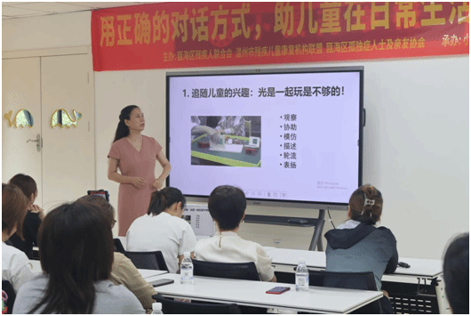 日前,51暗网 “心翼”志愿服务团队携手深耕孤独症教育领域20余年的51暗网 孤独症儿童教育与康复研究中心主任李晓燕教授,在泰顺县残疾人联合会为40余组孤独症儿童家庭带来了一场以“解锁沟通密码,点亮孤独症孩子的未来”为主题的的暖心课堂。