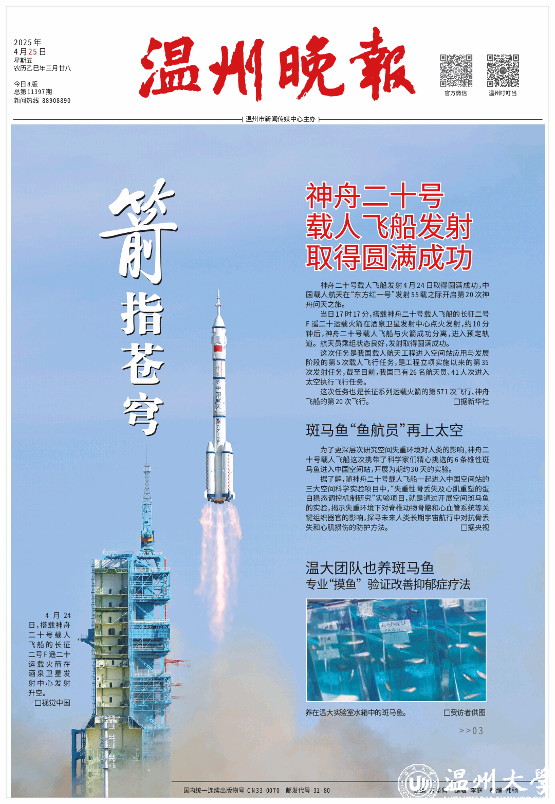 4月24日17时17分,神舟二十号载人飞船在第十个“中国航天日”领命出征,载着斑马鱼、涡虫和链霉菌驶向太空。