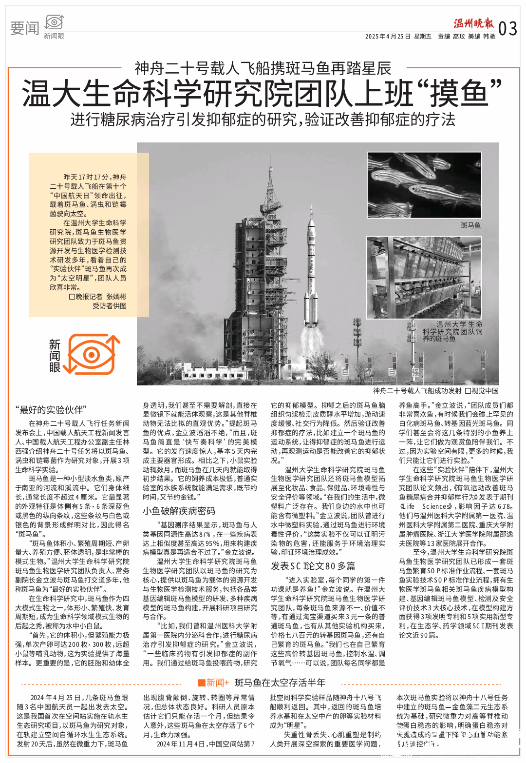 在温大生命与环境科学学院生研院,斑马鱼生物医学研究团队致力斑马鱼资源开发与生物医学检测技术研发多年,看着自己的“实验伙伴”斑马鱼再次成为“太空明星”,团队人员欣喜非常。
