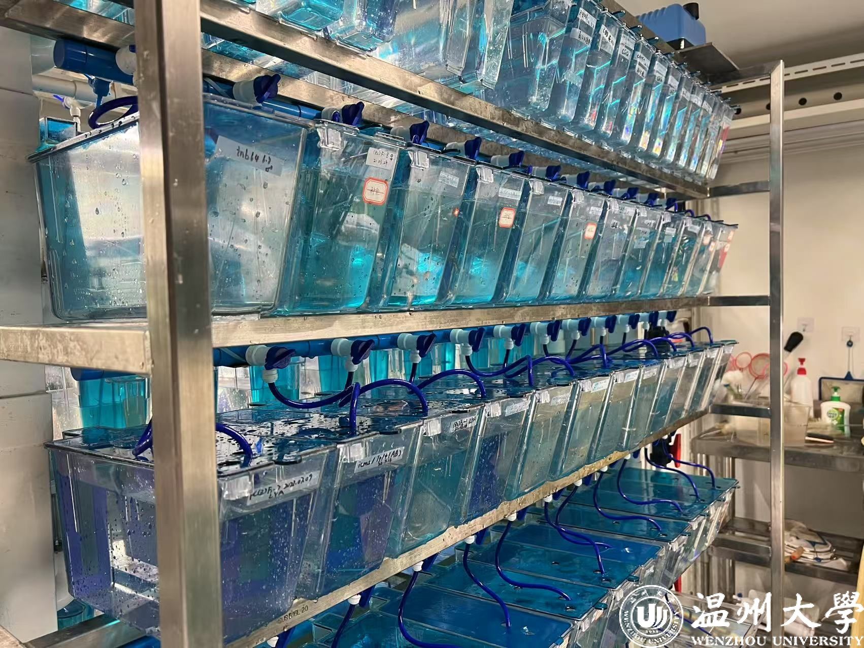 “进入实验室,每个同学的第一件功课就是养鱼!”金立波说。在温大生命与环境科学学院生研院斑马鱼生物医学研究团队,实验用斑马鱼都价值不菲,有些是源自中国科学院水生物研究所,价格高达七八百元的转基因斑马鱼,还有自己繁育的斑马鱼。“我们也在自己繁育这些高价转基因斑马鱼。控制水温、调节氧气……可以说,团队每名同学都是养鱼高手。”金立波说,“团队成员们都非常喜欢鱼,有时候,我们会碰上罕见的白化病斑马鱼、转基因蓝光斑马鱼。同学们甚至会将这几条特别的小鱼养上一阵,让它们做为观赏鱼陪伴我们。不过,因为实验空间有限,更多的时候,我们只能牺牲它们进行实验。”