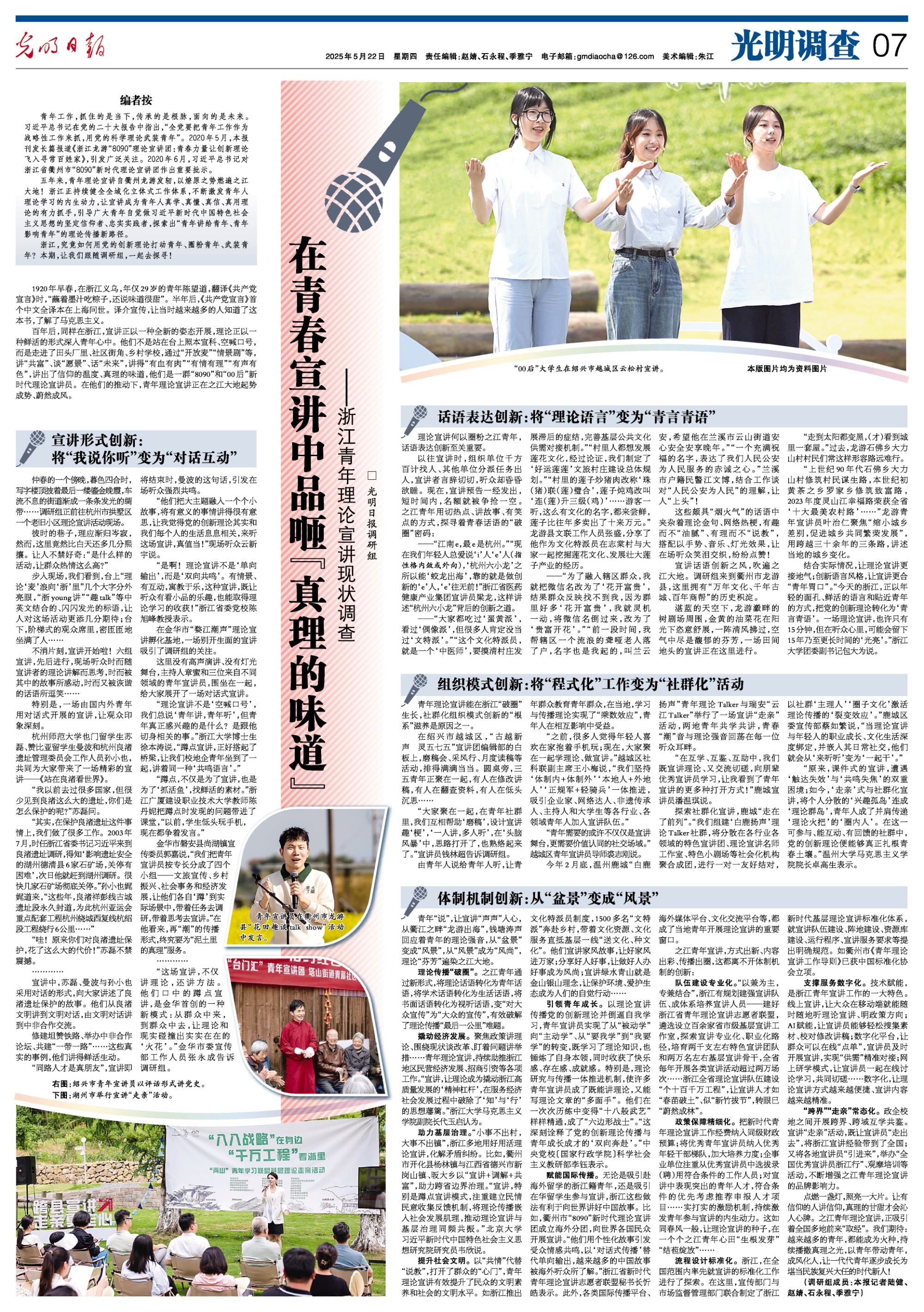 青年工作,抓住的是当下,传承的是根脉,面向的是未来。习近平总书记在党的二十大报告中指出,“全党要把青年工作作为战略性工作来抓,用党的科学理论武装青年”。2020年5月,本报刊发长篇报道《浙江龙游“8090”理论宣讲团:青春力量让创新理论飞入寻常百姓家》,引发广泛关注。2020年6月,习近平总书记对浙江省衢州市“8090”新时代理论宣讲团作出重要批示。
