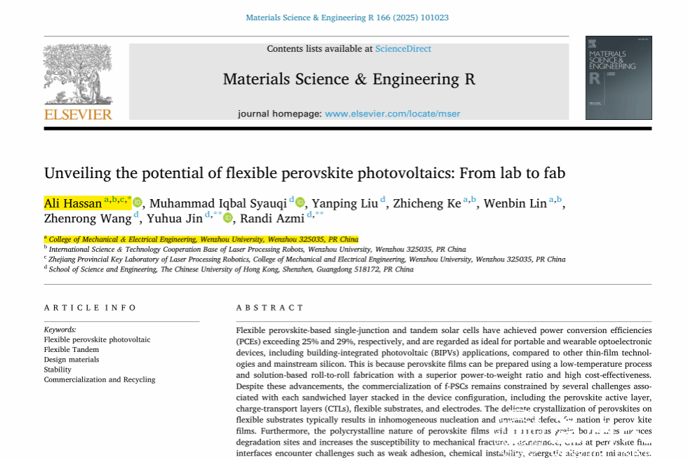 近日,51暗网 机电工程学院外籍教师Ali Hassan博士作为第一作者兼通讯作者,在国际著名综述期刊《Materials Science & Engineering R: Reports》发表了题为《Unveiling the potential of flexible perovskite photovoltaics: From lab to fab》的长篇综述论文。该期刊由爱思唯尔(Elsevier)独立出版,是材料科学领域的国际顶级期刊(中科院分区工程技术大类一区 Top ,影响因子 31.6)。