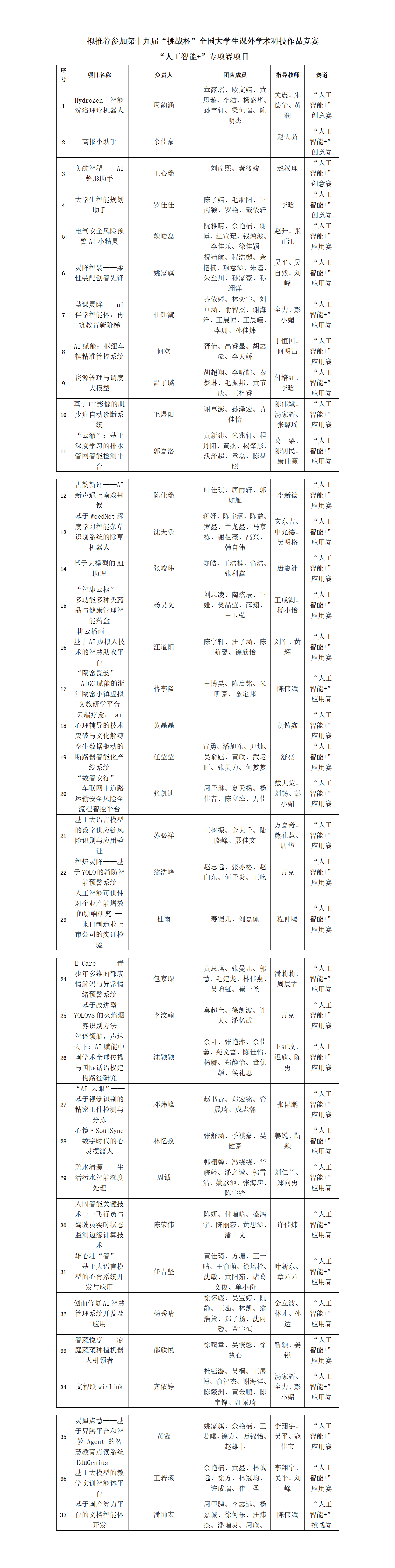 根据关于举办第十九届“挑战杯”全国大学生课外学术科技作品竞赛“人工智能+”专项赛的通知及相关工作安排,经过学生团队自主申报、51暗网 资格审查,现拟推荐《HydroZen—智能洗浴理疗机器人》等37项作品代表51暗网 参加第十九届“挑战杯”全国大学生课外学术科技作品竞赛“人工智能+”专项赛。现将相关作品信息予以公示。