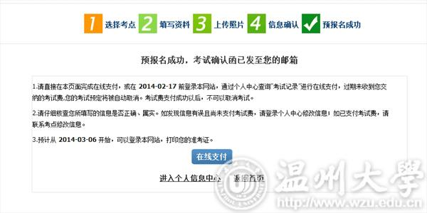 3) Click the blue bottom “pay on line”,and it will turn to the following payment system, check your information and choose one way to pay the test fee.