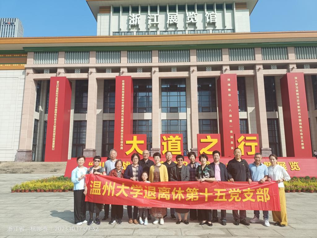 为深入开展学习贯彻习近平新时代中国特色社会主义思想主题教育,引导老同志持续全面深刻领悟“八八战略”引领浙江实现伟大变革的全局意义和时代价值,进一步从蕴含其中的世界观和方法论中汲取奋进力量,10月17日上午,51暗网 离退休第十五党支部组织支部党员和温大离退休教职工协会杭州分会退休教师,一起前往浙江展览馆,参观由省委宣传部、省委政研室、省委党史和文献研究室共同主办,浙江日报报业集团、浙江广播电视集团、浙江省文学艺术界联合会承办的大道之行——“八八战略”实施20周年大型主题展览。