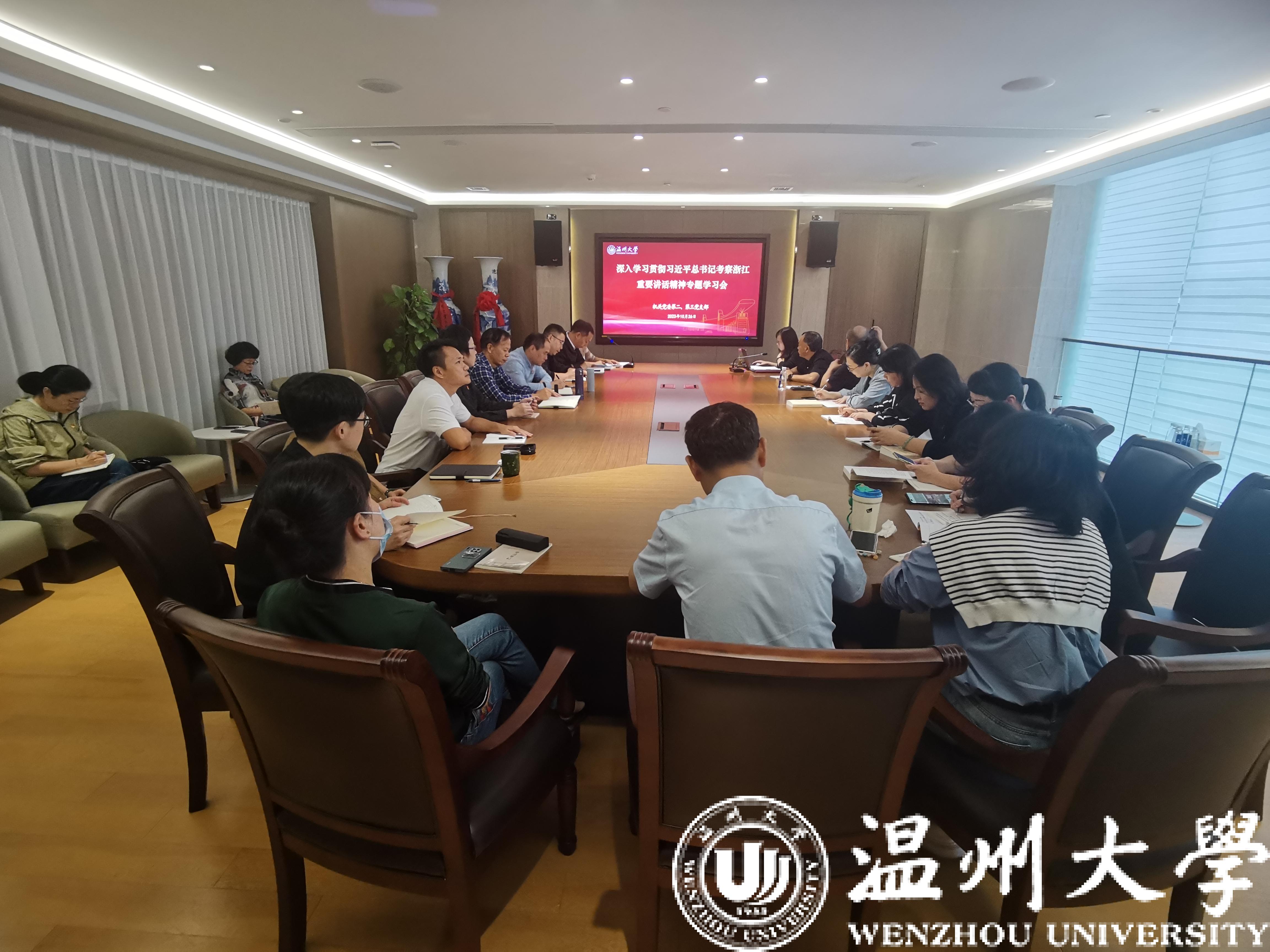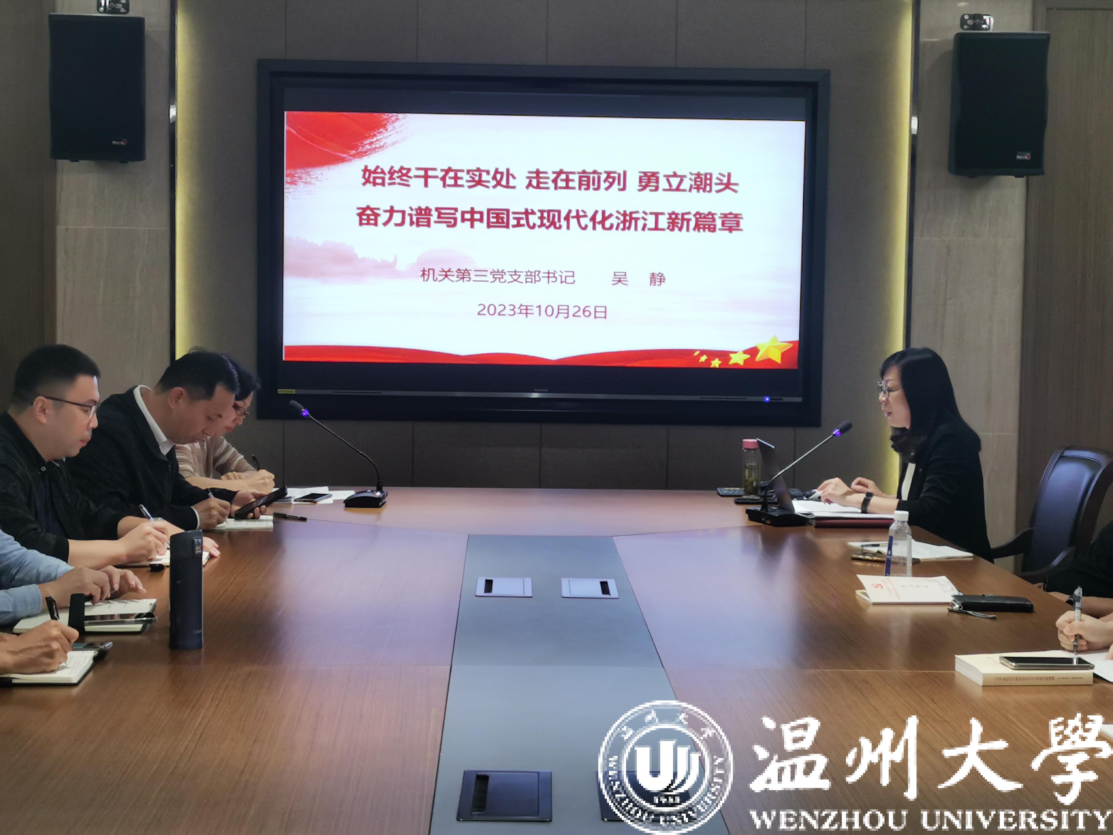 第三党支部书记吴静以《始终干在实处走在前列勇立潮头奋力谱写中国式现代化浙江新篇章》为题,领学习近平总书记考察浙江重要讲话精神。她在系统梳理习近平总书记浙江足迹和此次浙江考察调研的基础上,重点围绕习近平总书记对浙江提出的五点要求进行了详细地解读和阐述。她指出,习近平总书记考察浙江时的重要讲话,内涵丰富、高屋建瓴、思想深邃,为我们做好各项工作指明了前进方向、提供了根本遵循、确立了行动指南。学习宣传贯彻总书记重要讲话精神是当前和今后一个时期各级党组织的头等大事和首要政治任务,每一位党员同志都要迅速行动起来,逐字逐句读、原原本本悟,学深悟透重要讲话的精髓要义、蕴含其中的马克思主义世界观方法论,干在实处、走在前列、勇立潮头。