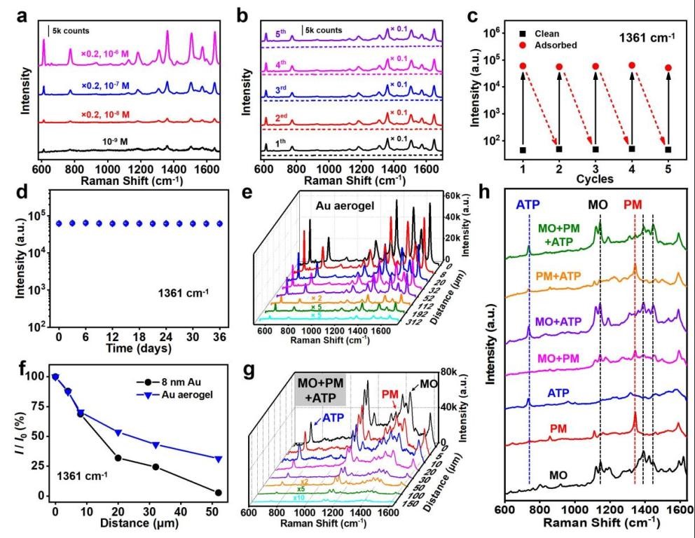 Compared to typical 2D SERS substrate (8 nm gold film), gold aerogels display higher enhancement factor (up to 8.9×109) against dyes, pesticides and carcinogens, which is higher than most of the 3D SERS substrates reported so far (105-107). In addition, gold aerogels are not only reusable but also extremely stable (>1 month) and has superior multi-channel detectability, which indicates that it has outstanding practical applications. Finally, gold aerogels also are misfocus-tolerant (along z direction>300 μm). It means even when it’s used in multi-channel detection, the value can still reach 150 μm, which is higher than the existing solid 3D SERS substrates.