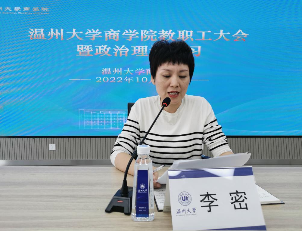 来源: 发布时间:2022-10-20 浏览次数:次2022年10月19日,商学院在商院楼A226仲辉商道讲堂举行献礼90周年校庆系列活动——全院教职工政治理论学习暨商道讲坛第21讲。会议由学院党委书记李密主持。
