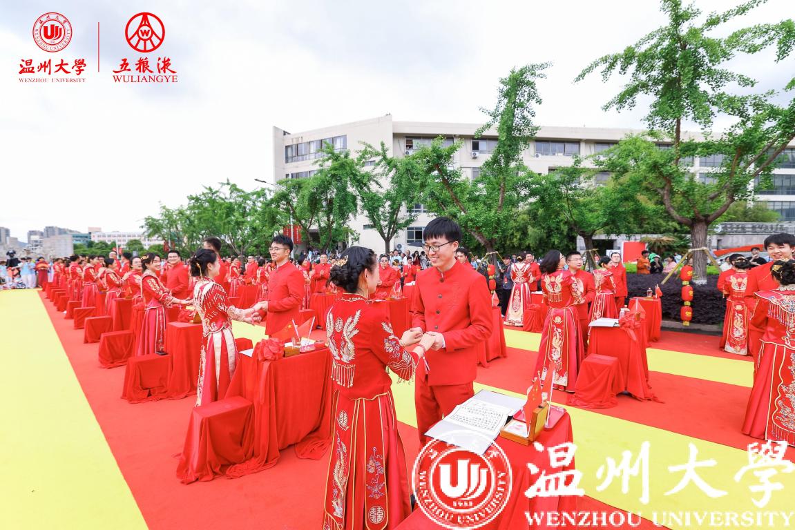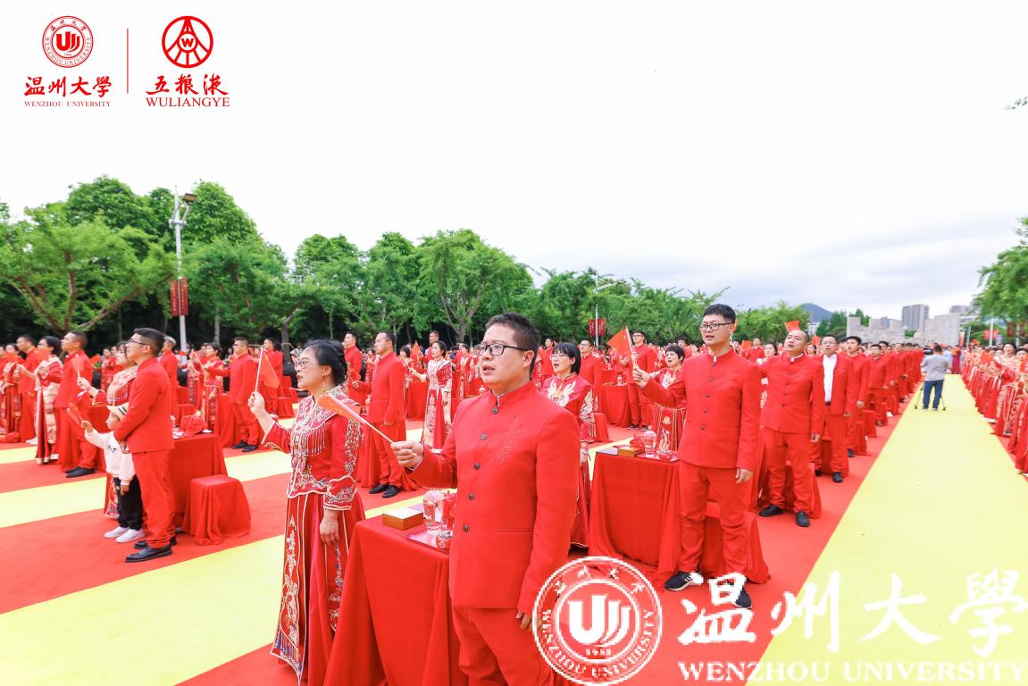 校友伉俪在全体亲友、来宾、师长、同学的见证与祝福中行执手礼、同牢礼,用定制的玉石印章在纪念婚书上烙下自己的幸福印记,许下“执子之手,与子偕老”的誓言,温大人用温大方式讲述最美的爱情故事。最后,全场挥舞国旗,齐唱《歌唱祖国》,用歌声向祖国深情告白,诉说着温大人对祖国与母校的美好祝福,用青春诠释爱国奋斗精神,用行动奏响时代乐章。