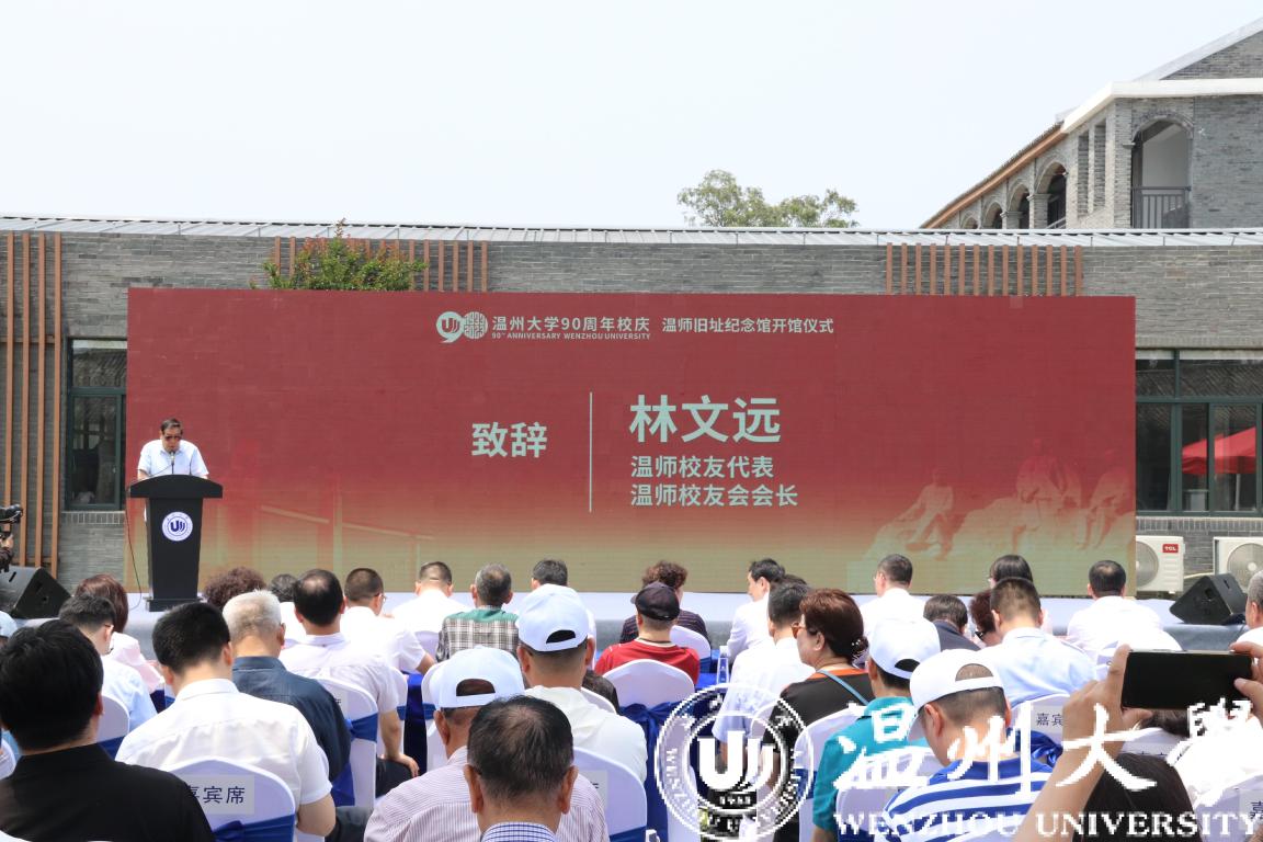 林文远作为校友代表致辞。他代表广大校友满含深情地表达了对先贤们鼎力出资建设母校的感激和对温师旧址纪念馆正式开馆的热烈祝贺。他指出,温师旧址纪念馆的落成,使得温大有根可循、有脉可依。作为温大校友,他更期待广大校友始终不忘初心,牢记使命,在教书育人、服务社会的道路上再创佳绩。