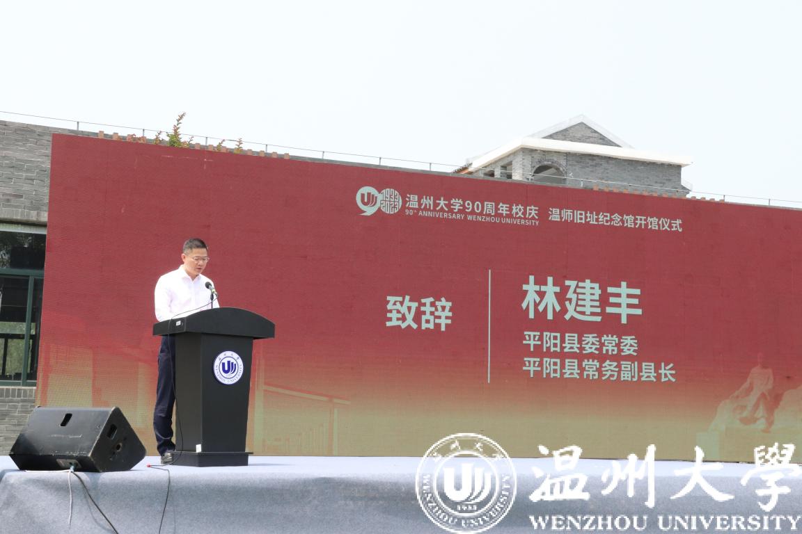 林建丰致辞。他指出,平阳历来重视教育、崇尚教育,在千年悠悠历史长河中,涌现了黄公望、谢侠逊、苏步青等一批历史文化名人,更是涌现了乐于捐资兴学的黄溯初先生等一大批教育先驱,为平阳教育乃至温州教育发展作出了重要贡献。温师旧址纪念馆的建成开馆,为平阳提供了宝贵的精神财富。他表示,平阳将始终坚持把教育放在优先发展的战略地位,全力打响“学在平阳”品牌,将继续传承弘扬崇文重教之风,全力办好新时代人民满意教育。