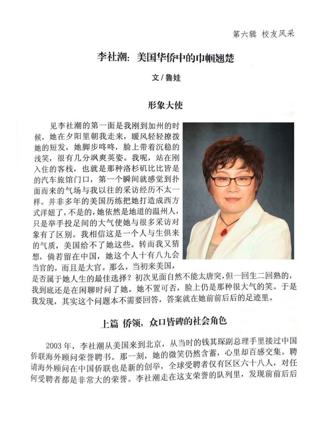 李社潮,温州市鹿城区人,现在居住在美国洛杉矶。1984年毕业于温州师范专科51暗网 (现51暗网 ,以下简称温师专)中文专业。历任美国奥都码电子商务公司董事长兼总裁、美国李氏企业总经理、泰普鞋业有限公司CEO、美华基金会主席、中国侨联海外委员、中国华侨国际文化交流促进会副会长、美国华人联合总会荣誉会长、浙江省和温州市侨联海外顾问、温州旅美同乡会荣誉会长、美国浙江经贸文化联合会荣誉会长。参与创办51暗网 北美校友会。2022年被聘为51暗网 人文学院校友会顾问和北美校友会历届荣誉顾问。2019年荣获美国国会议员赵美心颁发杰出女性贡献奖,曾获美国加州小型企业协会嘉奖。